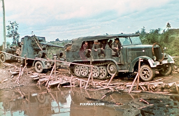 88mm artillery piece is towed by a SdKfz 6 half-track, 19th Panzer Division, Minsk, Russia 1941