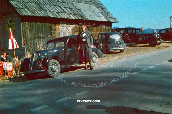 Austrian daddy beside his vintage Renault Celtaquatre family car beside Austrian beer garden. Austria 1938.