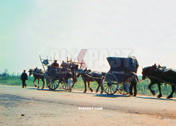 French civilian refugees transporting their last possessions by horse cart out of heavily bombed Verdun France July 1940