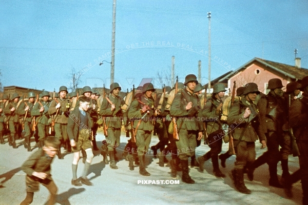 German Infantry Regiment wearing M18 helmets marching in Alt Otting in Bavaria Bayern Germany 1940