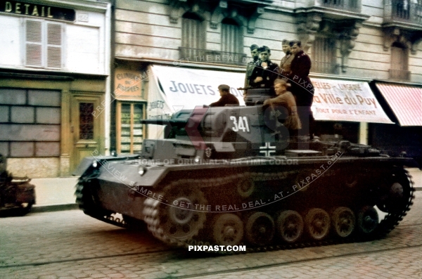 German Panzer 3 Tank No. 341 entering the bombed city of Loreans France 20.6.1940 France.