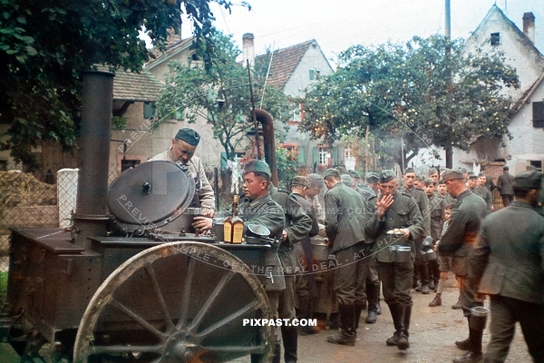 German soldiers eating Maggi soup from Gulaschkanonen. Westwall on french border. 1939. 14th infantry division