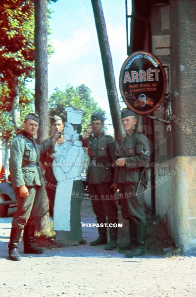 German soldiers from the 4th Panzer Division stand in front of a French restaurant. Transports Citroen Arret France 1940