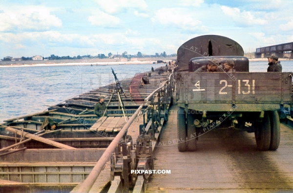 German soldiers in a captured Russian GAZ army truck crossing German river pontoon bridge in Ukraine 1942. Mg34 flak gun
