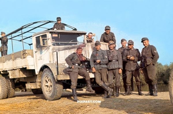 German soldiers posing in front of MAN type F 4 heavy transport truck. Crimea Krim April 1944. Sandfarbe camoflauge camo