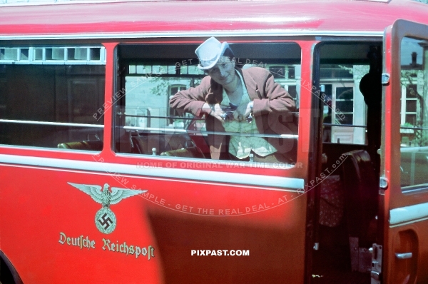 German women in full costume inside a red Deutsche Reichspost Bus. Munich Bavaria Germany 1940