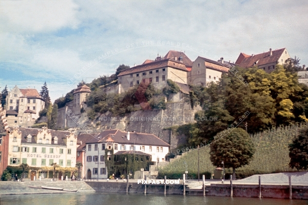 Harbour of Meersburg on Boden See Germany 1939. Hotel Seehof. Meersburg Castle. Burg Meersburg. Alte Burg.