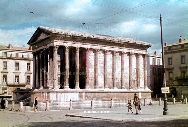 Maison Carrre, an ancient Roman temple located in Nimes southern France 1940
