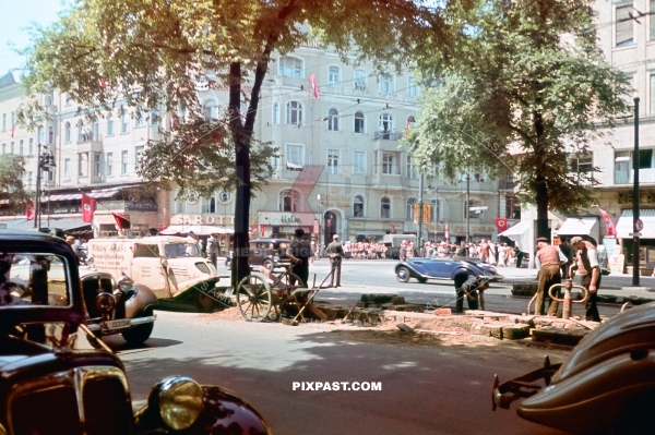 Road workers repairing road.Cafe Kranzler Kurfurstendamm corner Joachimsthaler Strasse. Berlin Germany June 1939