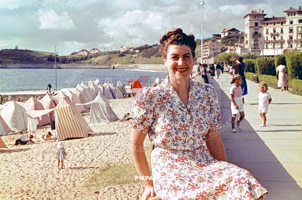 Smiling french women in summer dress. Promenade des Anglais in Nice, France Septmeber 1940