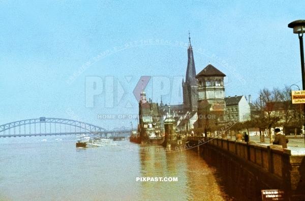 The Rhine bridge in Dusseldorf in west Germany NRW. Germany 1942. Luftschutz bunker yellow sign. Schlossturm.