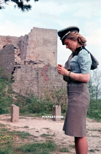 Young attractive wife of a infantry Wehrmacht officer wearing his army Peaked cap Schirmmutze. Lindau Germany 1944