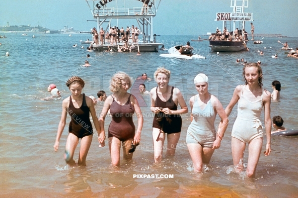 Young french women in swim suites playing the sea and beach in Saint Nazaire westcoast France September 1940