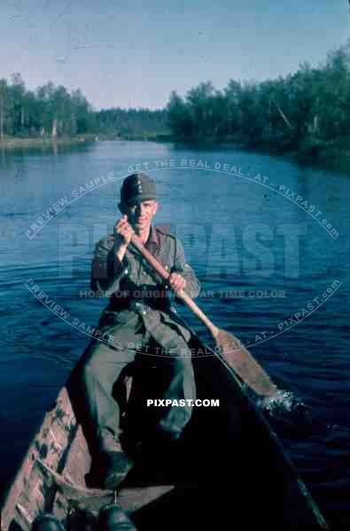 134th Gebirgsjaeger, Finland 1944, german soldier in boat on river.