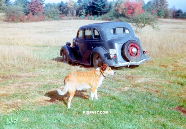 1936 Ford Four Door Sedan. American army officer with his lovely dog in Massachusetts USA 1941.