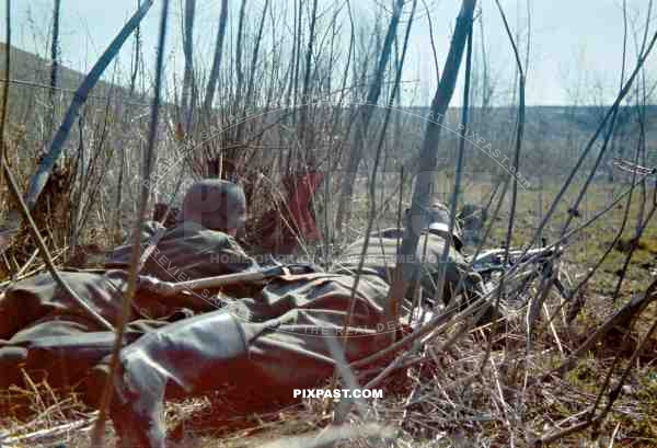 2 German Infantry soldiers with a MG 42 machine gun hiding in the long grass. Russian Front summer 1943