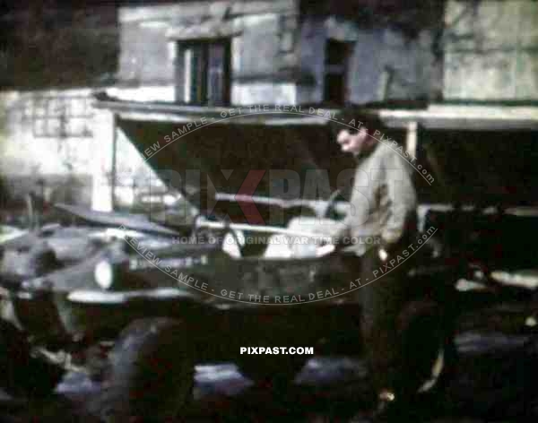 8mm home movie, France 1944, American GI soldier driving captured German Volkswagen Schwimmwagen Jeep.