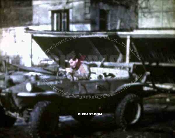 8mm home movie, France 1944, American GI soldier driving captured German Volkswagen Schwimmwagen Jeep.