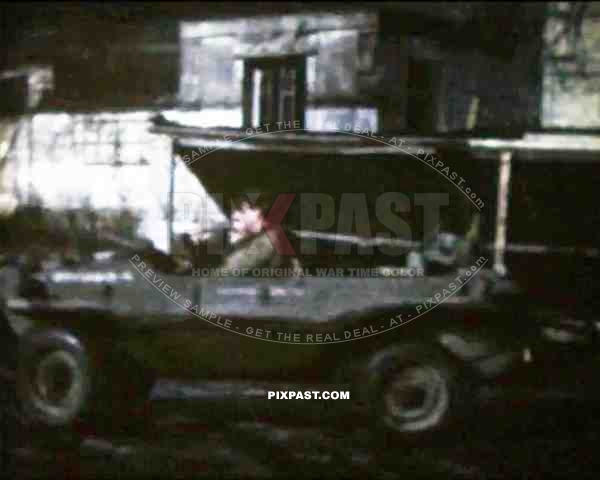 8mm home movie, France 1944, American GI soldier driving captured German Volkswagen Schwimmwagen Jeep.