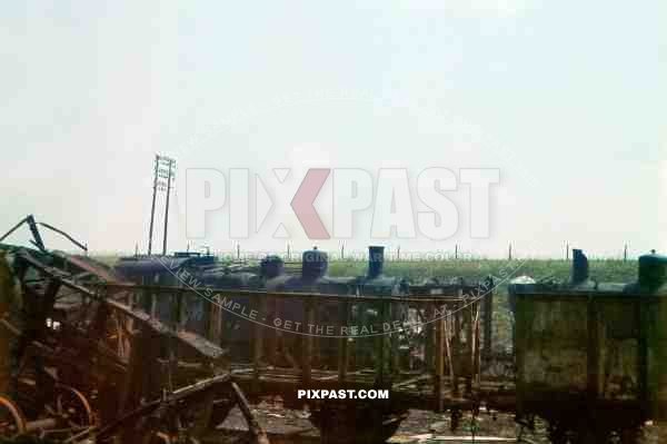 A German Steam Locamotive DEUTSCHE REICHSBAHN (DRB) passing by a bombed Greek train wreck. Greece 1942