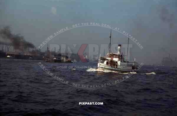 A tourist ferry crosses the River Elbe in front of the Port harbour Hamburg 1938
