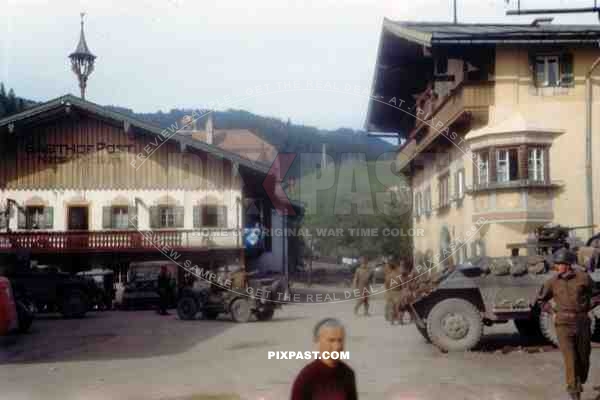 American armoured cars of the 101st Cavalry Regiment park opposite SS troops in Kossen Austria 1945.