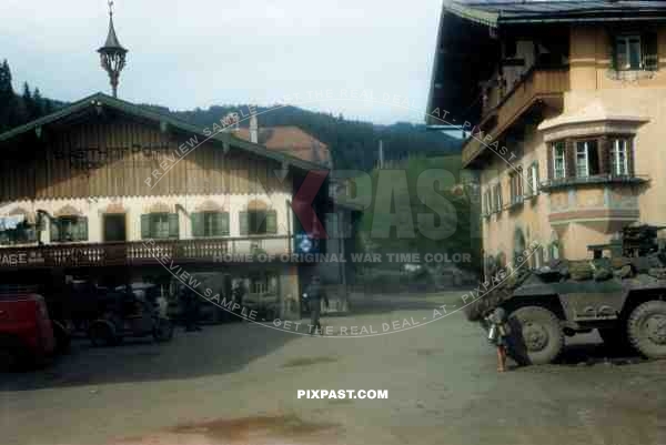 American armoured cars of the 101st Cavalry Regiment park opposite SS troops in Kossen Austria 1945.