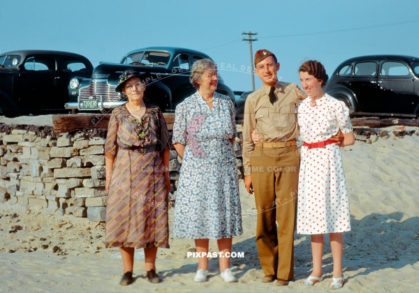 American artillery army officer with his wife, mother and step mother visiting the beach for a day out. California USA 1942