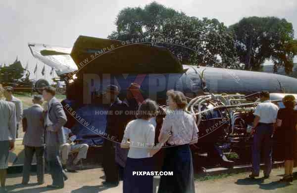American civilians inspecting a German V2 long-range guided ballistic missile in Washington DC. USA 1946.