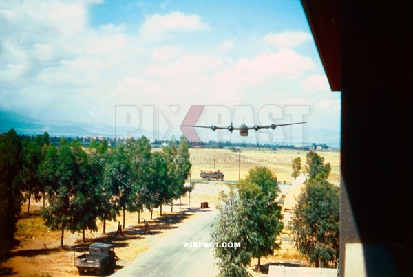 American Consolidated B-24 Liberator bomber plane doing fly by passed hotel in San Giovanni Italy 1944
