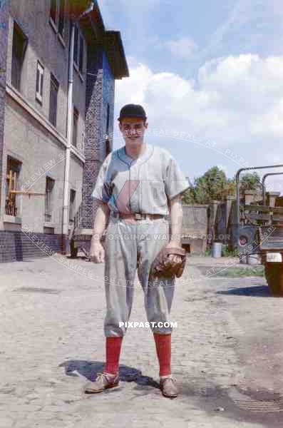 American GI soldier in full American Baseball uniform. Berlin army barracks. Germany 1946 OMGUS Team. Berlin League