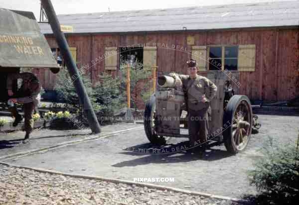 American GI soldier standing beside captured German 15 cm sIG 33 Howitzer. Army barracks. Homburg Germany 1945
