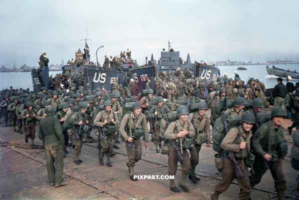 American infantry GIs unloaded from landing craft. Omaha Beach Normandy France. D-Day plus 4 1944