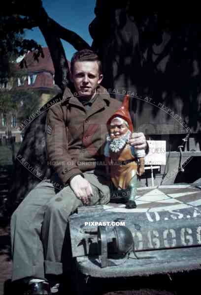 American soldier with german garden gnome SS Childrens School in Buchenwald Germany 1945 all children were playing with guns weapons willi jeep USA jacket Gartenzwerg 1st pattern enlisted ETO jacket Col Leslie Crozier Wood Oklahoma City 101st Mechanized Cavalry Reg Woody