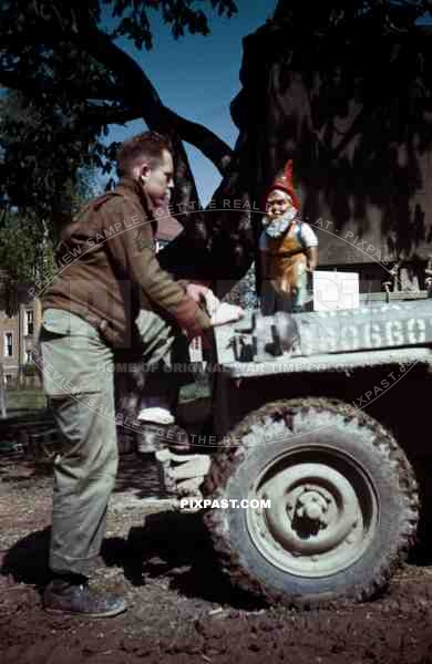 American soldier with german garden gnome. SS Childrens School in Buchenwald Germany 1945.