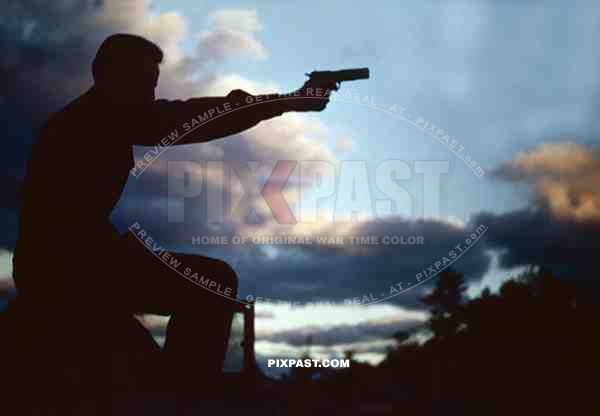 An American soldier standing on top of his Willys Jeep pointing his Colt m1911 pistol. Okinawa 1945