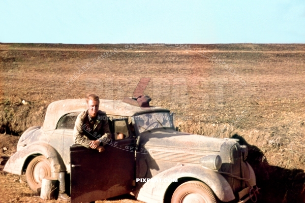 Army driver in his 1938 Opel Super 6 Cabriolet staff car in a Russian field near Stalingrad 1941. 297 Infantry Division