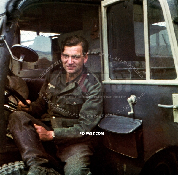 Army medical driver with blue shoulder boards sitting inside a leichter Lkw Steyr 640 - Kfz.70. Sevastopol KRIM Russia 1942