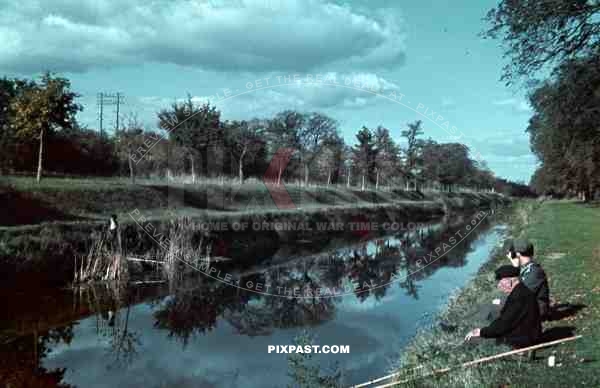 Austrian Military Soldiers Wehrmacht beside fisherman and canal relaxing Ginzling Austria 1939