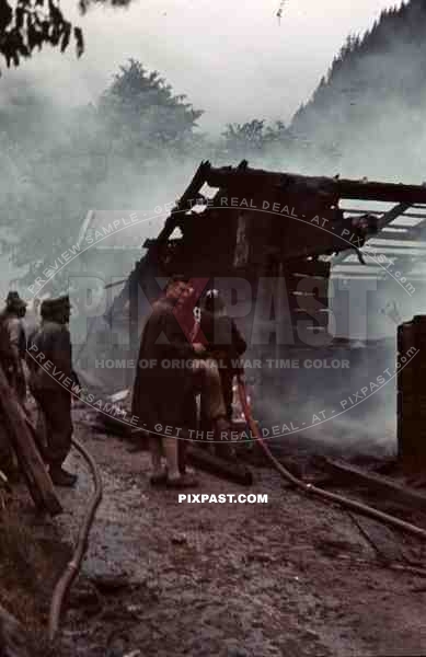 Austrian Pre War fire brigade in Uniform Helmet fight fire burning farm house Ginzling Austria 1939