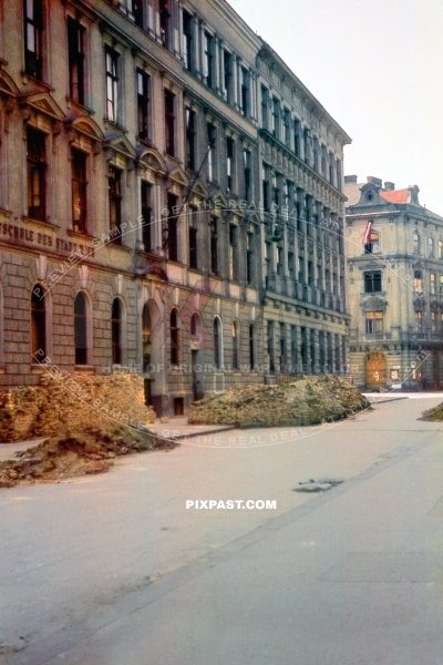 Battle damaged Vienna Austria May 1945. Local School badly damaged with piles of pricks on the road. Austrian flag.