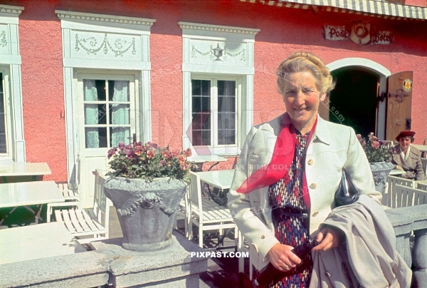 Bavarian German mother in front of Atlas Posthotel Hotel in Marienplatz Garmisch Partenkirchen. Germany 1939