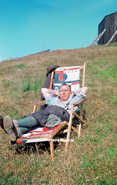 Bavarian hunter with long socks and shorts resting in sun chair Cacao beside Bodensee Lake Constance in Meersburg 1940
