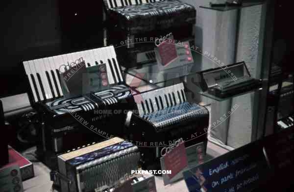 Berlin, 1939, Accordion Music shop window, Consumer Products, service offered in English and french. Odeon
