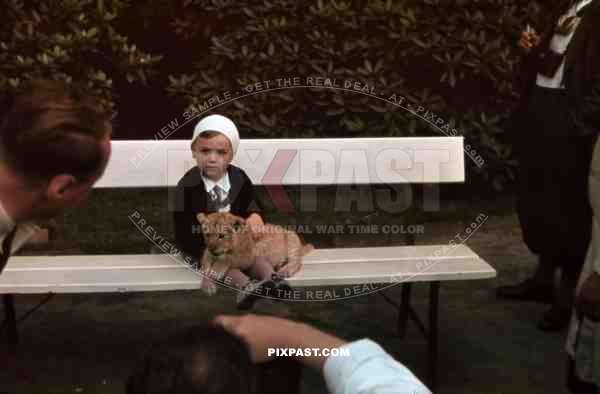 a small boy is posing with a lion baby for a photograph at the Dresden zoo, Germany 1939