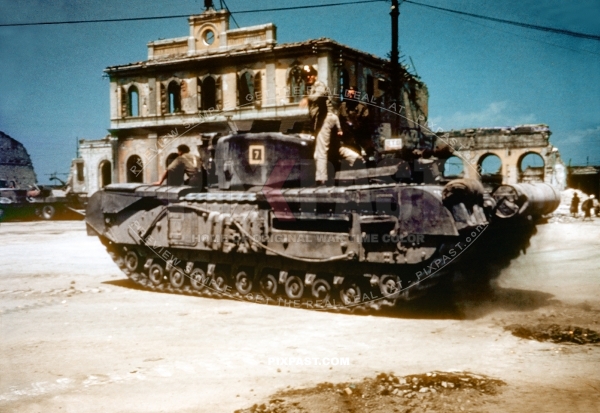 British army Churchill Tank Number 7 driving passed heavily bombed Italian train station. Italy July 1944