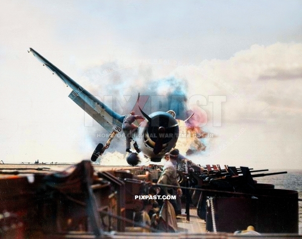 Burning Grumman F6F-3 Hellcat of VF-2 aboard USS Enterprise (CV-6) on 10 November 1943