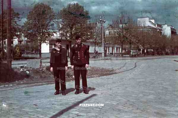 two Kriegsmarine soldiers standing in front of the bus station at Cours de Chazelles, France ~1940