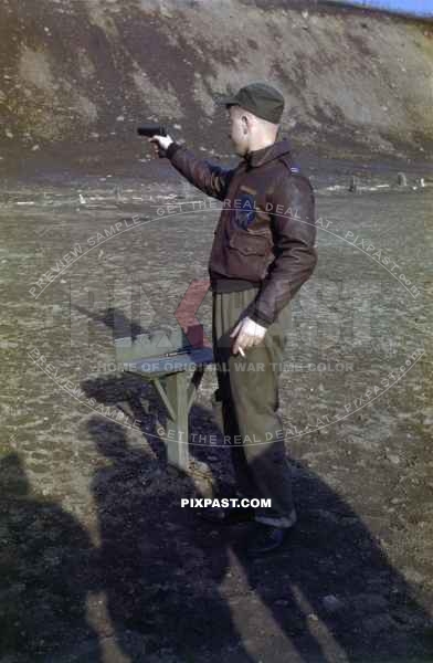 Butch Gleeson of the 322d Bombardment Group Medium does shooting training with a Colt M1911 in Florida USA 1942