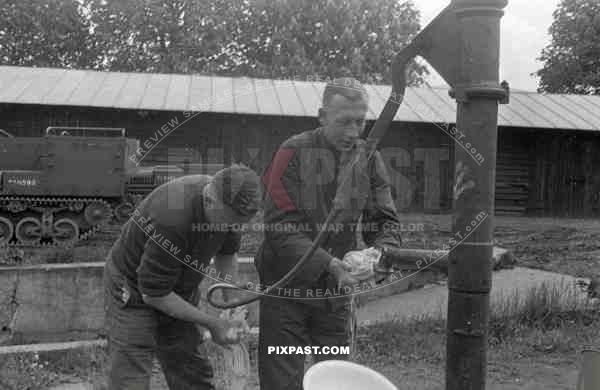 BW France 1940 German soldiers wash hands with captured french panzer tank transporter